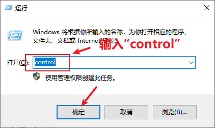 2、在弹出来的运行框内输入“control”,再点击确定: