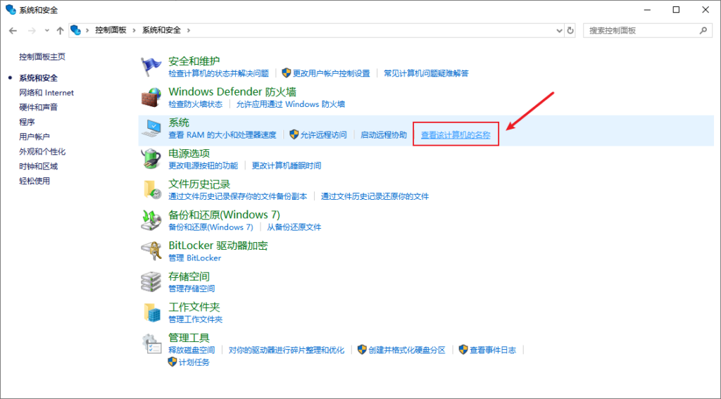 4、点击系统和安全页面中的“查看该计算机的名称”: