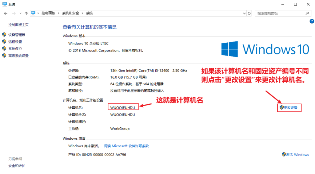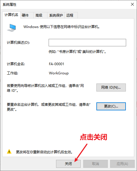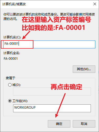 5、查看目前操作的电脑的计算机名,核对是否和该电脑的资产标签编号相同,如果不相同,则将该计算机名改为该电脑外壳上贴的固定资产标签的编号;如果贴的固定资产标签是FA-00001,则将该计算机名也改为FA-00001: