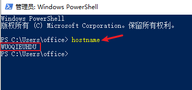 3、在弹出来的管理员命令行界面中输入”hostname“,再按回车查看这台电脑目前的计算机名;如果该电脑的计算机名和该电脑外壳上贴的固定资产标签编号不同,则需要将该计算机名改为该电脑对应的固定资产编号: