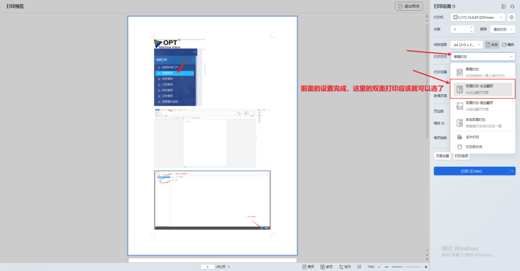 7、在文档处理软件中选择预览,在预览的打印机设置中点击打印方式,选择双面打印: