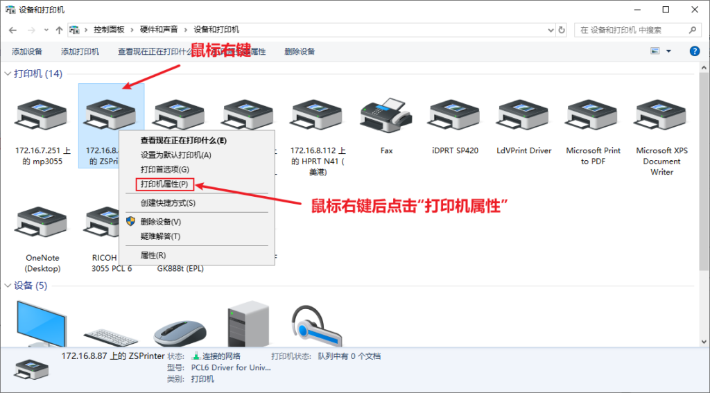 4、选中要设置双面打印的打印机,右键该打印机,在弹出来的选项中点击“打印机属性”,会有点卡,等一下: