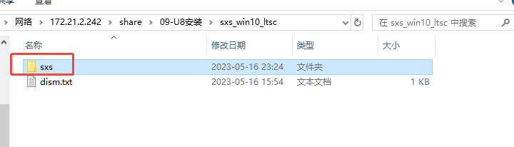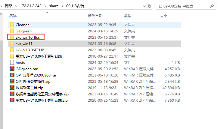 1、按路径进入共享文件夹\\172.21.2.242\share\09-U8安装,双击进入“sxs_win10_ltsc”(若电脑系统为win11,则进入“sxs_win11”)