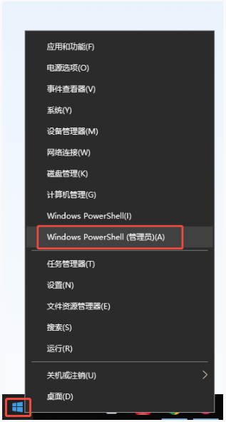 3、右键选择“开始图标”,点击Windows PowerShell(管理员)