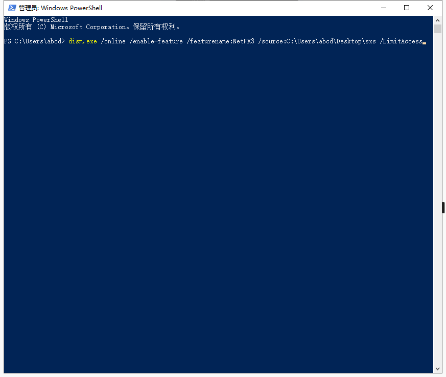 4、输入“dism.exe /online /enable-feature /featurename:NetFX3 /source:PATH /LimitAccess”(中间的PATH替换为上边sxs文件夹的路径,下图以粘贴到桌面为例)