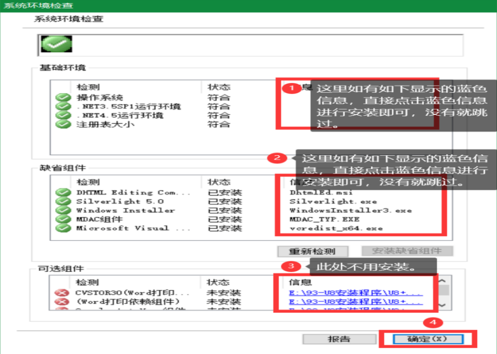15、如果有显示蓝色的信息,直接点击链接进行安装。点击重新检测确保“基础环境”和“缺省组件”全为“√”后,点击确定