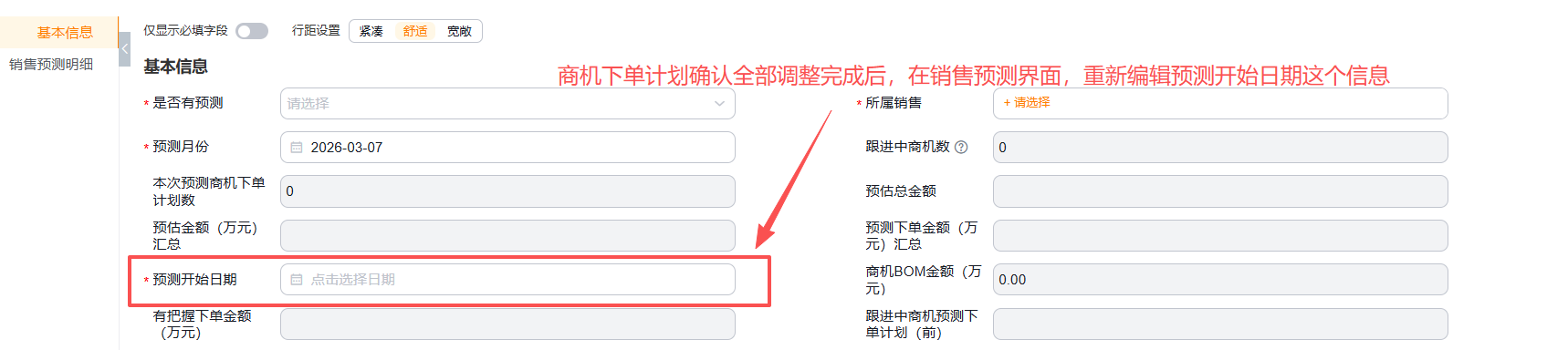 1.1 如果能查出数据,说明确实存在早于【预测开始日期】之前的进行中的商机预测下单计划,需要针对查询出来的所有数据进行调整。全部调整完成后,回到销售预测界面,重新编辑下【预测开始日期】字段,再点击提交即可。