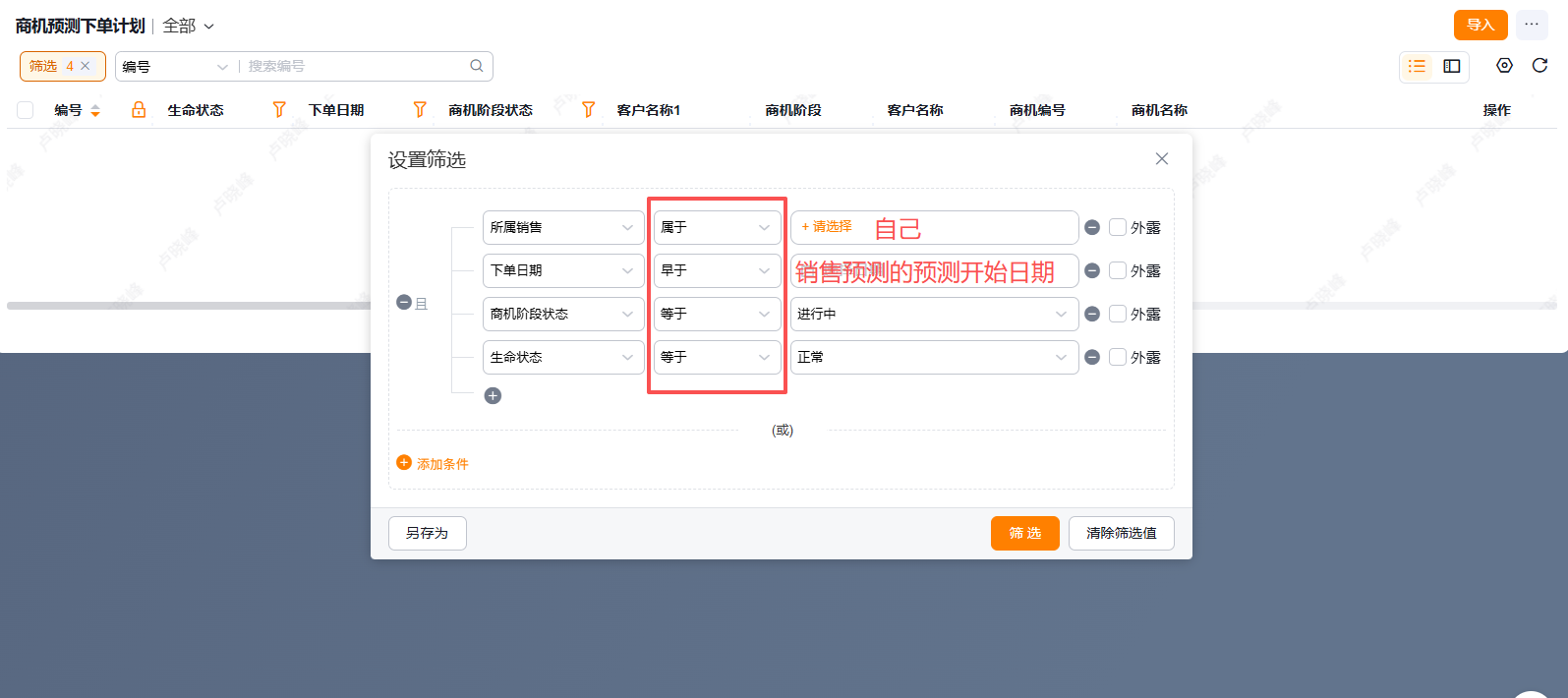 1、请先在【商机下单计划】表单查询,确认是否查询出来数据。 查询条件:所属销售=自己;下单日期小于预测单填写的预测开始日期;商机阶段状态等于进行中;生命状态等于正常