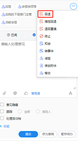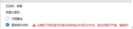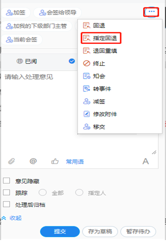 指定回退:将当前节点回退至前任意已办节点处理,对于发起者将回退到其待发中,注意回退时可选择回退后流程重新提交方式分别为流程重走,或直接提交到当前发起退回的节点