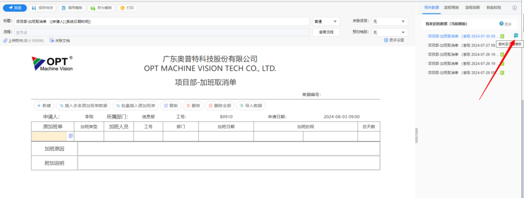 打开表单后在右上角相关数据中有我发起的历史表单数据,鼠标悬浮后出现复制模板按钮,可以复制历史表单的表单内容