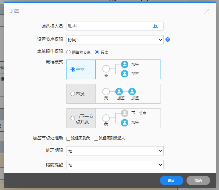 并发:选择的加签人员在该处理人与后续节点间并行处理。