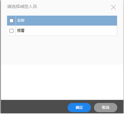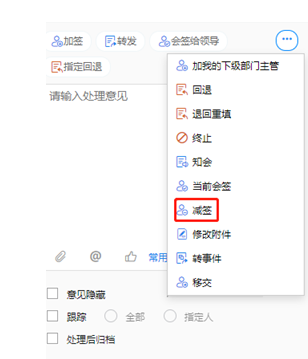 减签:处理者可在当前节点之后减少一级节点,每次可减一个后续节点,可进行连续减签操作,但最终节点为结束时不可减签,回退至当前操作者不能进行减签操作。