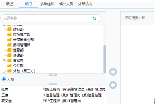 移交:支持当前处理人将待办事项转件给其他人进行处理,移交后当前处理人不再在流程中,流程处理将转至移交人,移交人员只支持单选。