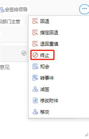终止:终止当前流程,后续节点不会接到该流程,待办节点的事项将被取消,进入已办事件备查。