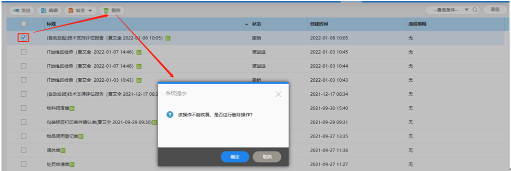 前提:流程未结束、回退。如需删除回退状态单据,请先点击发送,再按以上步骤操作。