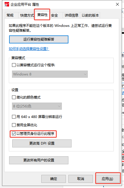 2、选择兼容性,勾选以管理员身份运行此程序,点击应用
