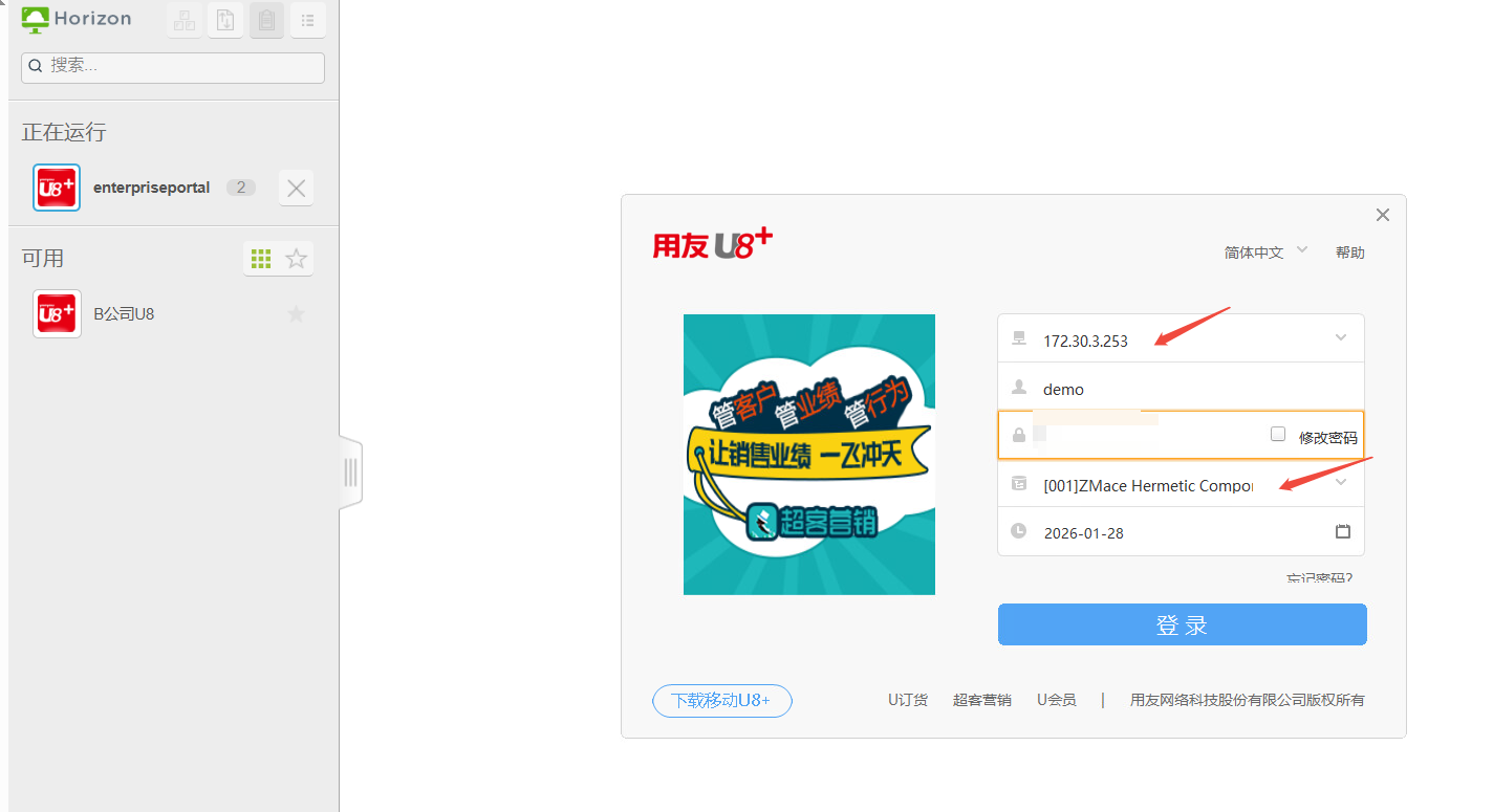 4、出现U8登陆框,注意,首行的地址是内网服务器地址,只能填这个:172.30.3.253
